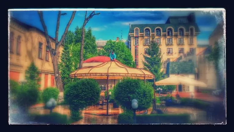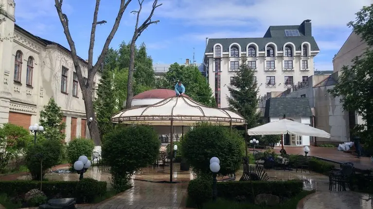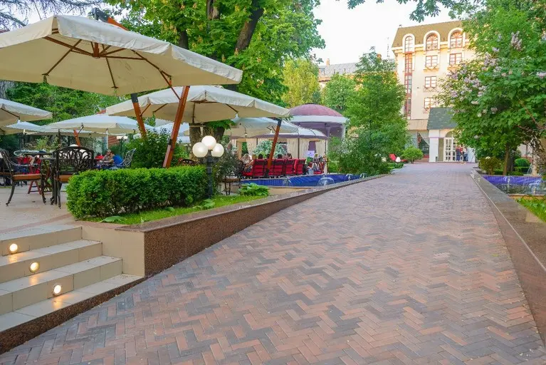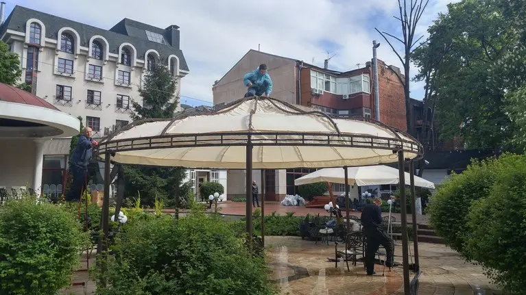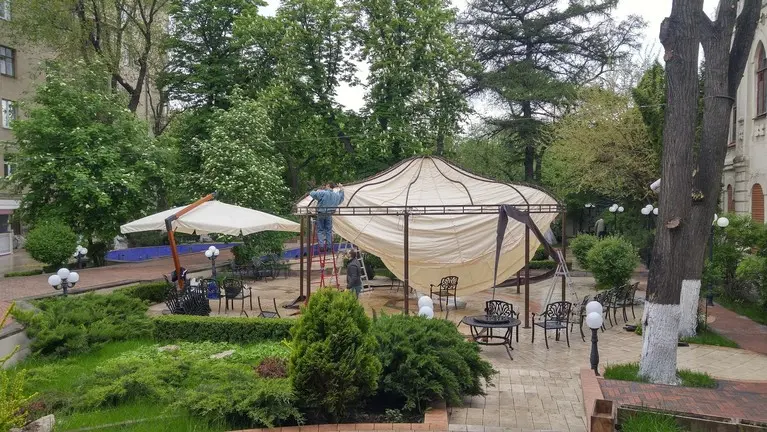 Летняя площадка с шатрами и зонтами.