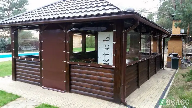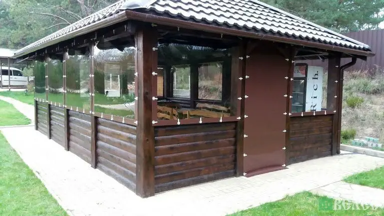 Летняя кухня из бруса с прозрачными стенками ПВХ.