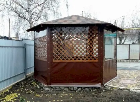Ажурный каркас с полупрозрачной крышей из поликарбоната плюс прозрачные шторы ПВХ по периметру - и вот уже готовая комфортная и практичная зона для отдыха ...