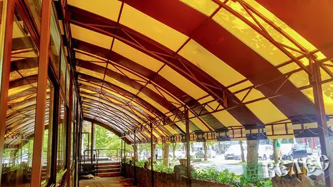 Основным преимуществам подобных конструкций является их дешевизна приятный эстетический вид. Посетители кафе под таким навесом всегда в комфорте : летом - приятная равномерная освещенность и отсутствие "прямых" лучей солнца, весной и осенью - защита от ветра, дождя и других погодных неблагоприятных условий.