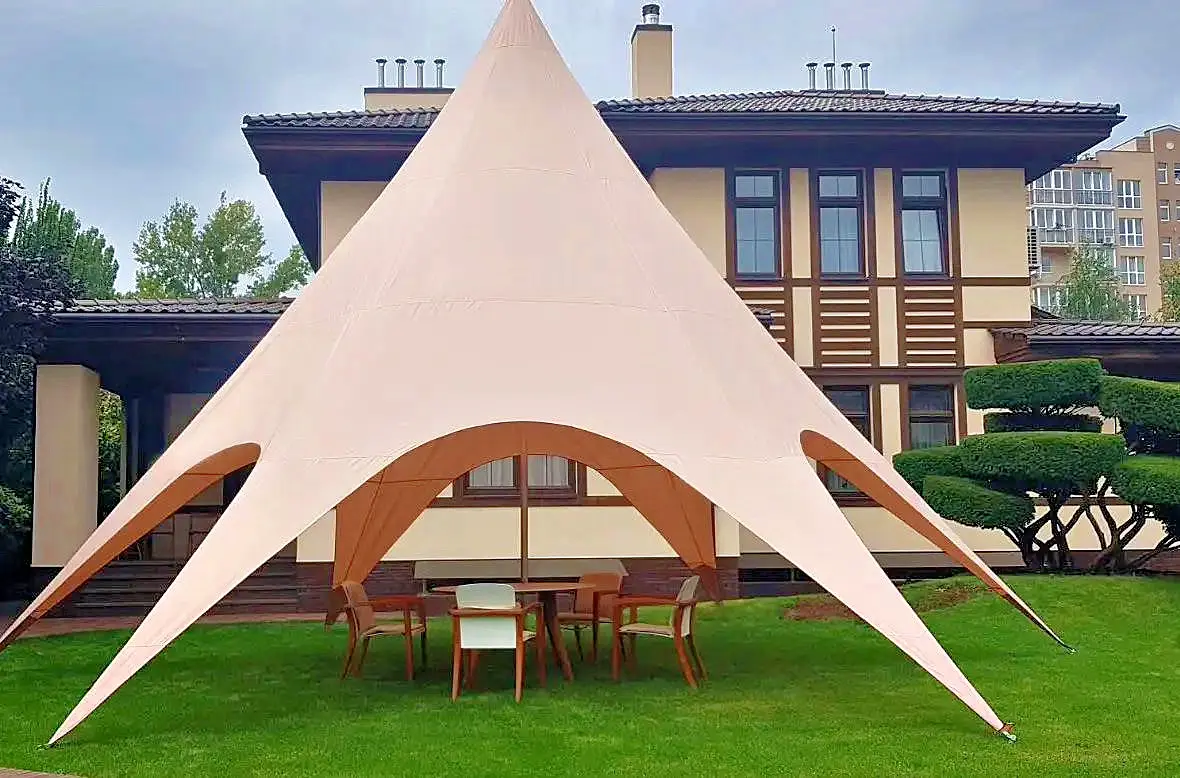 Тент "Звезда" обладает уникальной формой. Его покрытие, имеющее от 5 до 9 "лучей", натягивается на одну или несколько высоких опор. затем тент закрепляется за землю или другую стабильную основу с помощью ремней и крюков. Взглянув сверху на такую структуру, можно увидеть купол с длинными лучами.