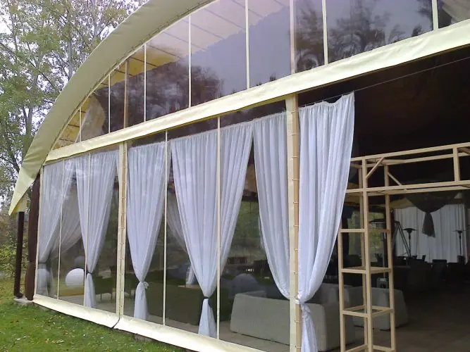 Шторы из ПВХ ткани подчеркивают дизайн беседки и придают ей эксклюзивность, создают возможность декорирования внутренней части беседки или веранды  шторами из текстиля  и другими предметами интерьера для создания уюта.