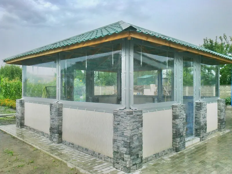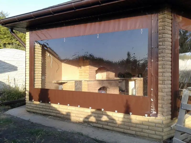 • из полностью прозрачной пленки (ПВХ) – в таком варианте исполнения они дают возможность видеть окружение. Цвет окантовки прозрачных окон подбирают так, чтобы шторы гармонично вписывались в общий дизайн беседки и вашего участка в целом.